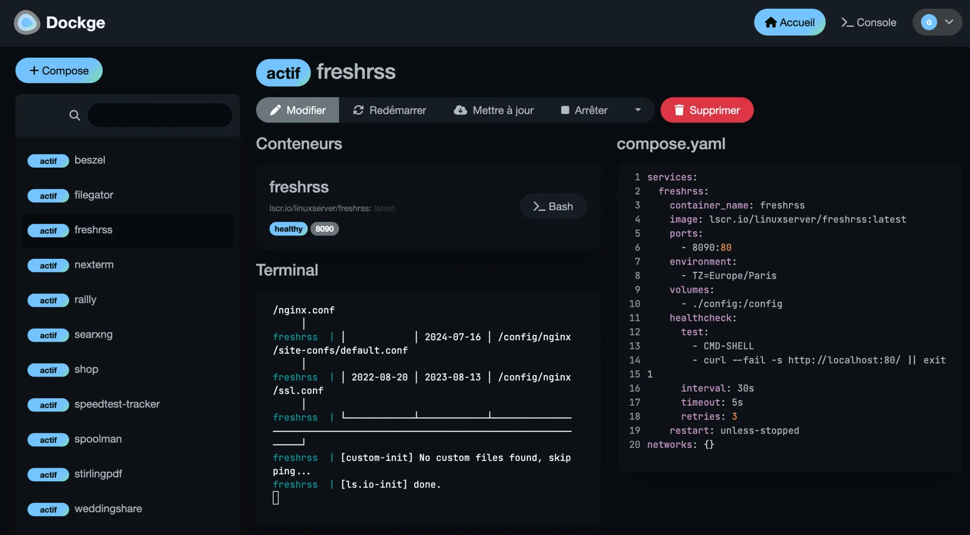 En cliquant sur le nom d'une stack, on dévoile sur la droite un affichage détaillé de cette dernière, avec en premier les boutons d'action (Modifier, Redémarrer, Mettre à jour, Arrêter/Démarrer), puis tous les conteneurs qui la composent avec l'image utilisée, leur statut et les ports, les logs de la stack, le fichier compose.yaml tout à droite avec son fichier .env en-dessous s'il existe.