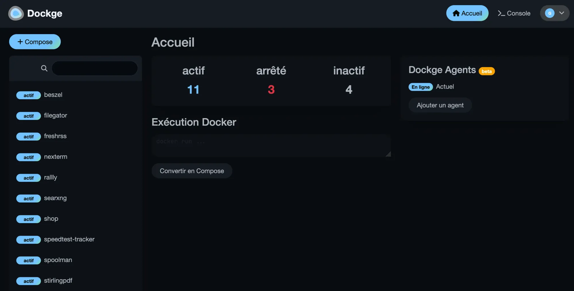 Au lancement, Dockge scanne automatiquement le répertoire  des stacks et affiche au centre un résumé du nombre de stacks par statut, sur la gauche une liste des stacks trouvées avec leur nom et état (actif / inactif / arrêté) et enfin sur la droite les agents connectés. Vous noterez également la possibilité d'insérer une commande docker run pour la convertir en fichier compose qui sera ensuite géré par Dockge.