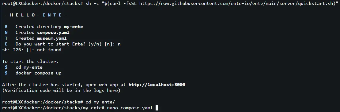 sh -c "$(curl -fsSL https://raw.githubusercontent.com/ente-io/ente/main/server/quickstart.sh)"