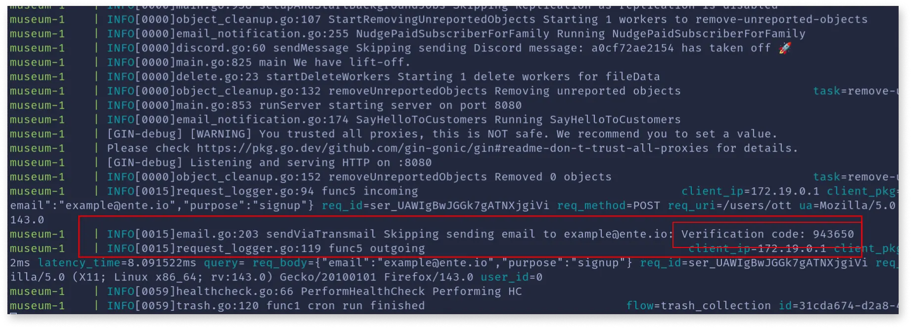 Si vous souhaitez recevoir les codes de vérification par email plutôt que dans les logs, vous devez configurer un serveur SMTP dans le fichier museum.yaml :