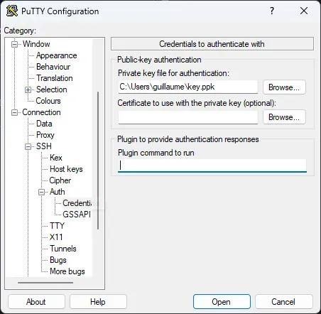 user@adresse-serveur - Connection > SSH > Auth > Credentials : charge ton fichier