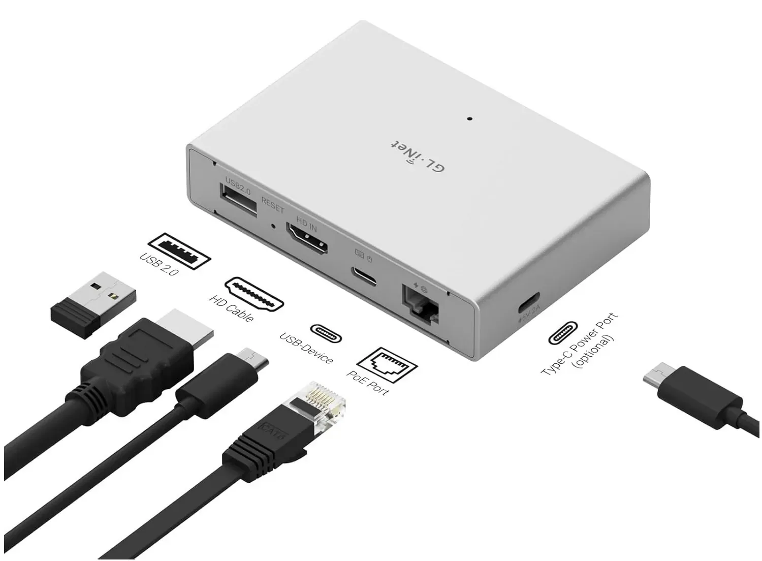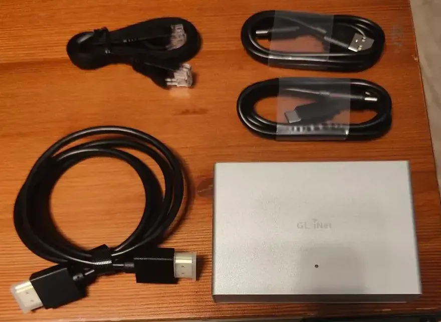 Le GL-RM1PE est livré avec l'essentiel : câble HDMI, câble Ethernet, deux câbles USB (USB-A vers USB-C et USB-C vers USB-C), et un guide de démarrage rapide.