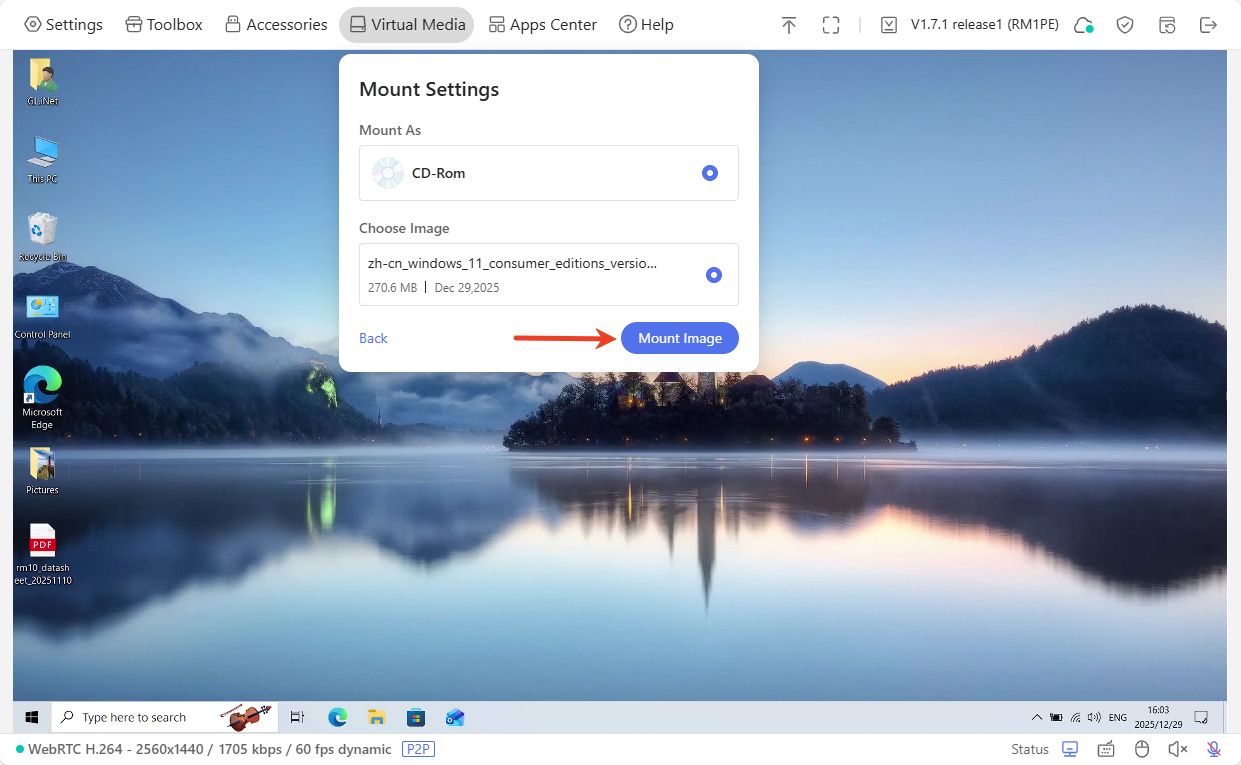 Le Comet PoE intègre 32 Go de stockage eMMC, et c'est plus utile qu'il n'y paraît. La fonctionnalité la plus précieuse : le montage d'ISO. Vous uploadez une image directement via l'interface web (Proxmox VE, Ubuntu Server, Debian, Windows Server), et le boîtier la présente à la machine cible comme un lecteur CD virtuel. Résultat : vous pouvez installer ou réinstaller un OS entièrement à distance, sans jamais toucher une clé USB physique. Fini la galère de la recherche d'une clé de 16 Go quand vous ne trouvez que des vieilles 4 ou 8 Go au fond d'un tiroir.