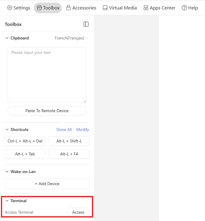 Connectez-vous au terminal depuis l'interface web dans l'onglet Toolbox → Terminal → Access et suivez ces quelques étapes rapides :