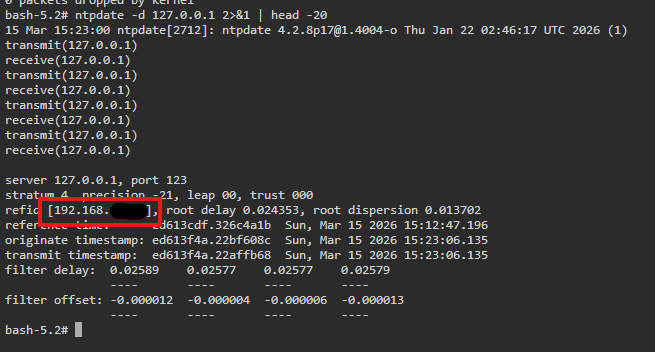 ntpdate -d 127.0.0.1 2>&1 | head -20